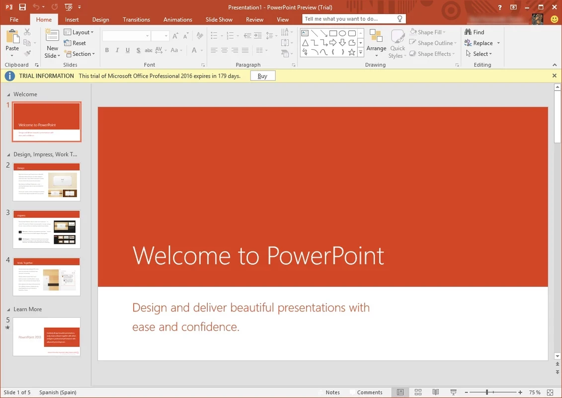 Una interfaz fluida y fácil de usar para ordenadores de escritorio ofrece numerosas mejoras visuales en comparación con Office 2013. Es necesario conectarse a internet para ejecutar varias funciones y obtener una funcionalidad mejorada.